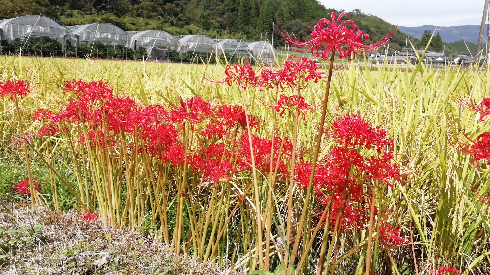 彼岸花がちょうど見頃で、田んぼの畦のところにキレイに色づいていました。