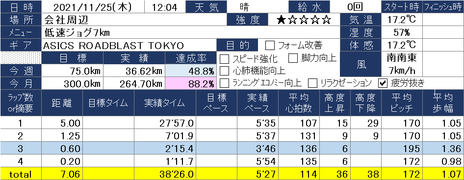 負荷の高いワークアウトが多かったので、今日は疲労抜き目的のジョグをしました。