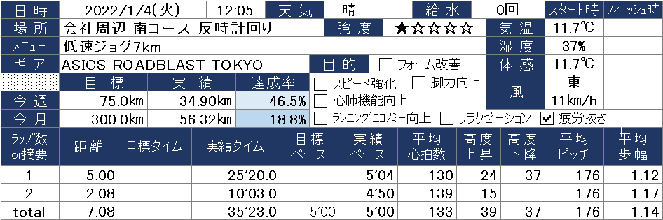 2022/1/4(火) 低速ジョグ7km 2022-01-04 今日まで休みでしたが、業務の都合上、自主的に出勤。 昼休みを利用して、7kmを快調ジョギングしました。 離地と接地を意識して走りました。 しばらくは意識して走らないと、自分のモノにならないと思います。 これが身に付けば、更なる向上が期待できそうです💪 目次カウントダウン関連 カウントダウン 別府大分毎日マラソンまであと33日 延岡西日本マラソンまであと40日 関連 2022/1/3(月) 市町村対抗駅伝最終選考会 & LSD22km走前の記事 2022/1/5(水) 中速ジョグ6km & 堤防練習会次の記事