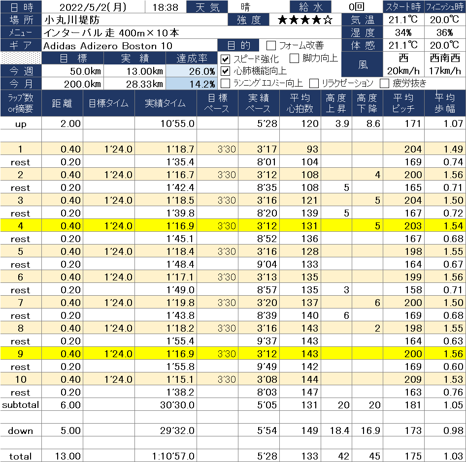 2022/5/2(月) インターバル走 400m×10本 2022-05-02 今日はポイント練習。 400mを10本、インターバル走を行いました。 一人でやる練習はきついですね。 関連 2022/4/19(火) 中速ジョグ12km前の記事 オリーブ 生育状況次の記事