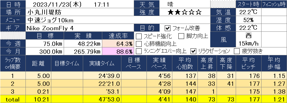 今日はどうしても10kmは走っておきたかったので、5’00/kmを切るペースで巡航。