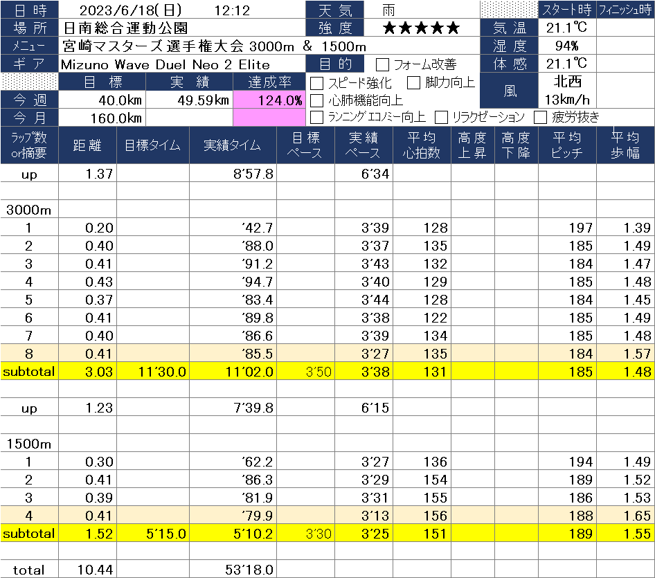3000m の目標は 11’30(3’50/km、0’92/400m)、何とか死守したい。