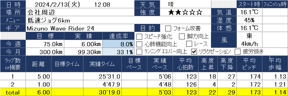 2024/2/13(火) 低速ジョグ6km 2024-02-14 昨日は大事をとってランオフ。今日は昼休みにゆっくりジョグしました。ニュースでも言ってましたが、2月にしては異例の暑さらしいです。 目次カウントダウン関連 カウントダウン 舞鶴ロードレース大会まであと19日 西都原このはなマラソン大会まであと33日 かどがわ健康ロードレースまであと40日 関連 2024/2/11(日) 都農尾鈴マラソン ハーフの部 人生初のDNF前の記事 2024/2/14(水) 堤防練習会 ペース走9km次の記事