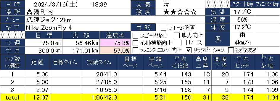 2024/3/16(土) 低速ジョグ12km 2024-03-20 明日は 西都原このはなマラソン。いつもどおりのトレーニング。 目次カウントダウン関連 カウントダウン 西都原このはなマラソン大会まであと1日 かどがわ健康ロードレースまであと8日 関連 2024/3/15(金) 久峰ナイトラン 1500m×2本前の記事 2024/3/17(日) 西都原このはなマラソン 5kmの部次の記事