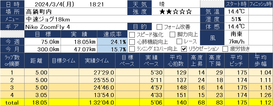2024/3/4(月) 中速ジョグ18km 2024-03-04 10kmくらい走ろうかと思って出かけたジョグ。昨日のレースの悔しさがこみ上げてきたせいか、倍近くの18km走っちゃいました😅 目次カウントダウン関連 カウントダウン 西都原このはなマラソン大会まであと13日 かどがわ健康ロードレースまであと20日 関連 2024/3/3(日) 舞鶴ロードレース大会10km前の記事 2024/3/5(火) 中速ジョグ7km次の記事