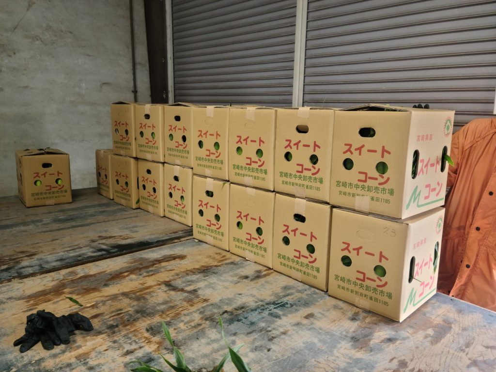 収穫作業が終わったら、出荷作業の一部、収穫したスイートコーンを選別して箱詰めする作業です↓