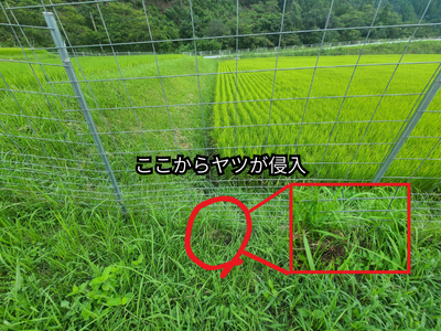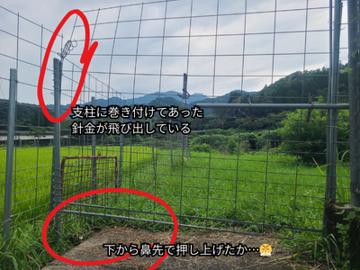 この圃場は外柵が2重にしており、まずはこちらの鉄柵扉の下のほうを花で強引に押し上げ、その隙間から侵入。