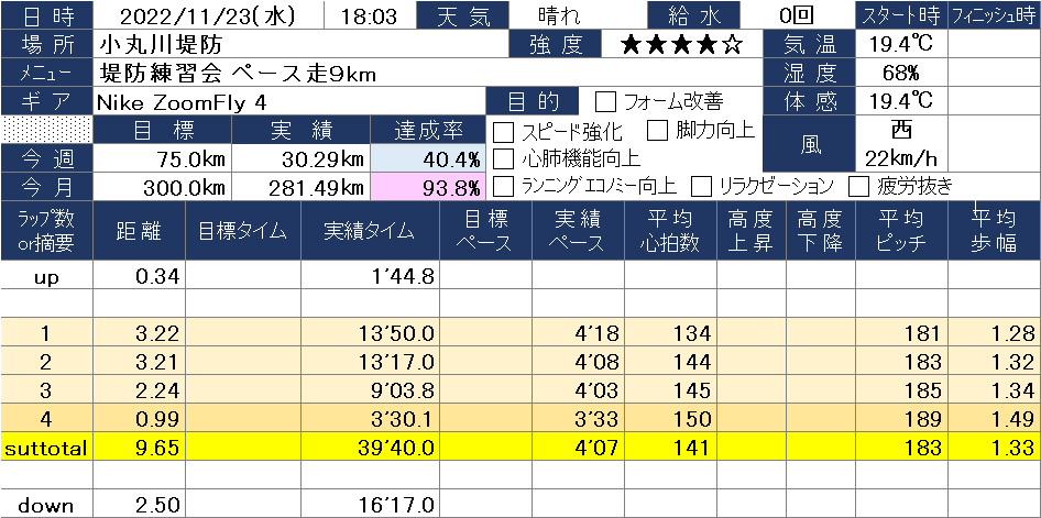 初めは4’30/kmペースで押していったが、1km過ぎた頃だろうか、体が動くようになってきたので、ペースを徐々に上げていった。