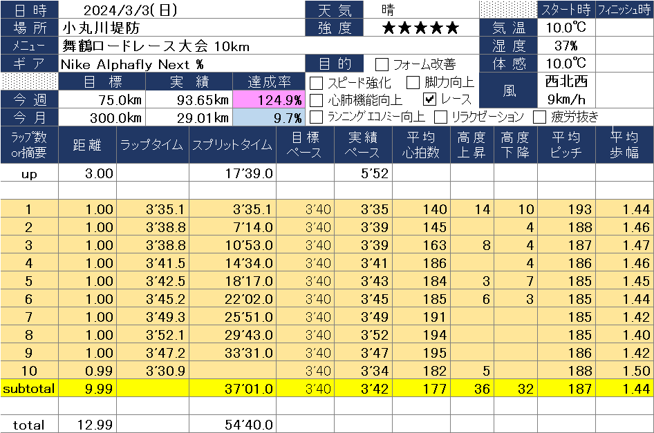 目標タイムは、2023/11/12、ロードレース in かわみなみ で出した自己ベスト 36’42 を更新すること。